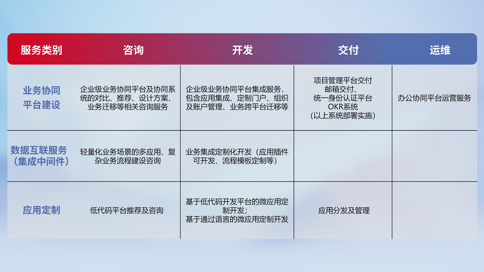 针对钉钉、、、、企微、、、、IDaas等平台级产品提供产品的规划、、方案、、交付、、定制化开发等服务,,,,实现如统一协同办公、、、智能客户服务、、、混合会议管理、、智能数据查询、、等业务场景,,,实现数字化转型。。